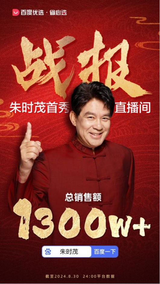 十多年后,小品界的“扛把子”朱時(shí)茂老師首次直播帶貨選定在百度優(yōu)選直播間,并創(chuàng)下單場(chǎng)GMV破1300萬(wàn)的記錄。