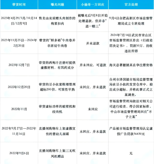 除了以上兩大翻車史,根據(jù)天眼查整理的公開資料顯示,近兩年小楊哥帶貨翻車不下5次,多數(shù)事件并沒有回應(yīng),也沒有做出相應(yīng)退款,詳情如下圖: