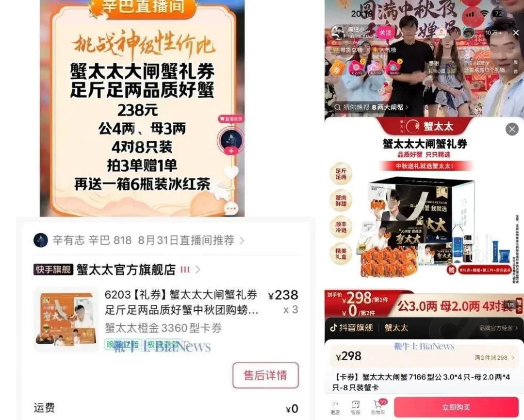 回顧事件起因:在8月31日的一場(chǎng)直播中,辛巴上架了一款238元的“蟹太太”蟹卡禮盒,包括4兩的公蟹4只和3兩的母蟹4只,且 “拍三送一”,并額外贈(zèng)送6瓶冰紅茶。