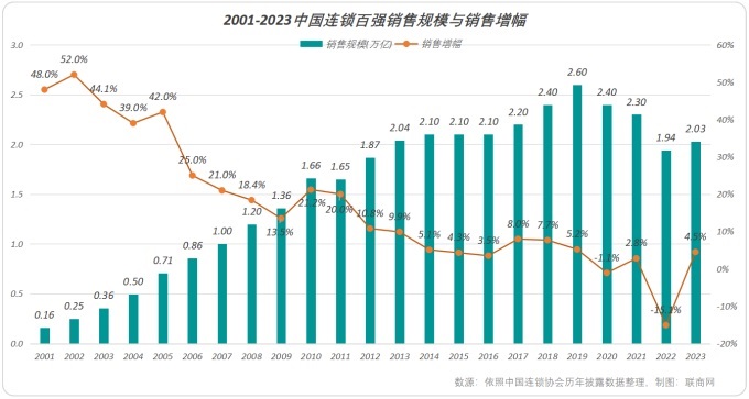 按照中國連鎖經(jīng)營協(xié)會(CCFA)數(shù)據(jù),從2014年以后,中國零售連鎖百強業(yè)績增長長期在低位徘徊。