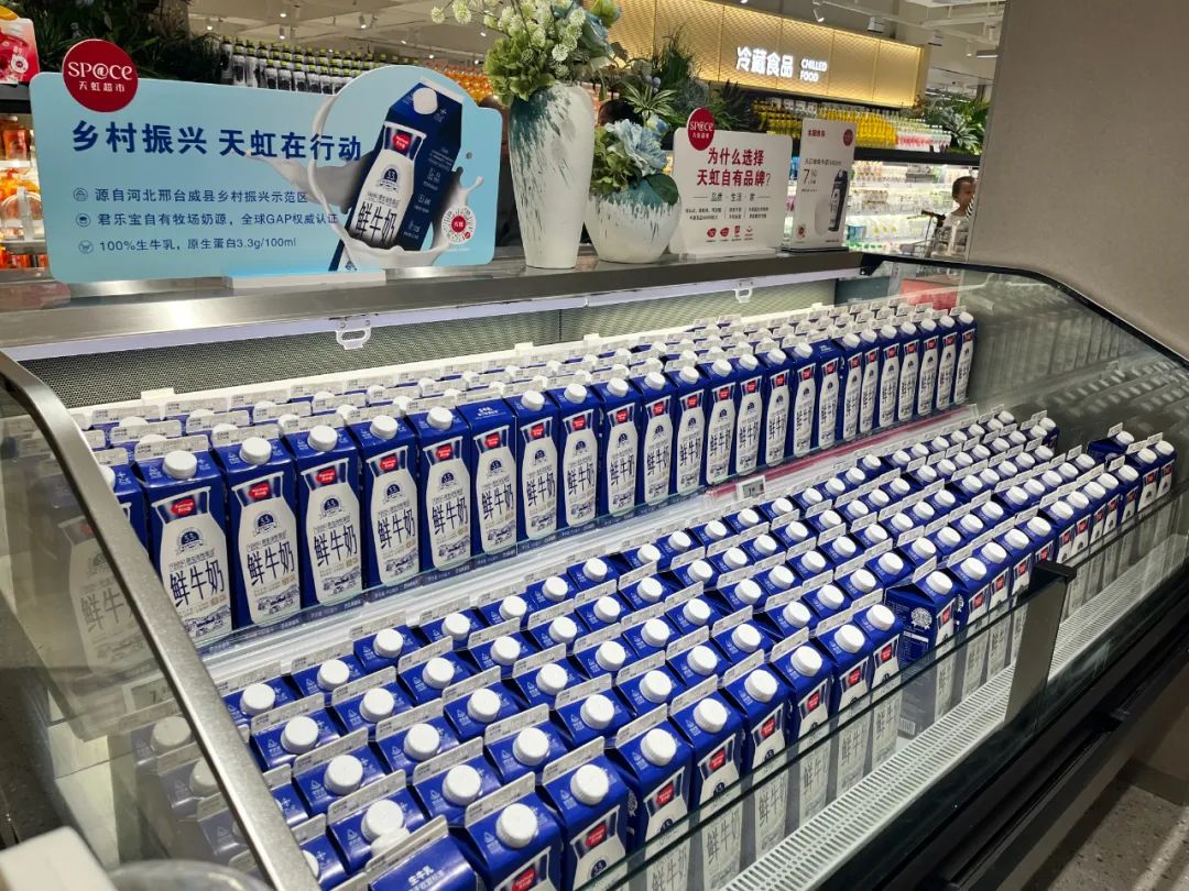 如天口味鮮奶,它是“天虹低溫奶第一心智商品”。天虹發(fā)現(xiàn),在顧客群體中,鮮奶以其卓越的客單量與滲透率脫穎而出;于是,在大牌林立的品牌池中,天虹最終攜手君樂寶,依托其世界級的研發(fā)技術(shù)及質(zhì)量安全管理體系,合作共創(chuàng),最終打造出“民生支持第一大單品”,950ml長期省心平價7.9元,全網(wǎng)可比。該品原生蛋白質(zhì)含量高達3.3克(遠超2.9克國標),生牛乳菌落總數(shù)僅為歐盟標準的一半,體細胞數(shù)量也低于歐盟標準;同時,該商品基地還是鄉(xiāng)村振興、助農(nóng)扶貧基地的一塊,體現(xiàn)了天虹的社會責任擔當。