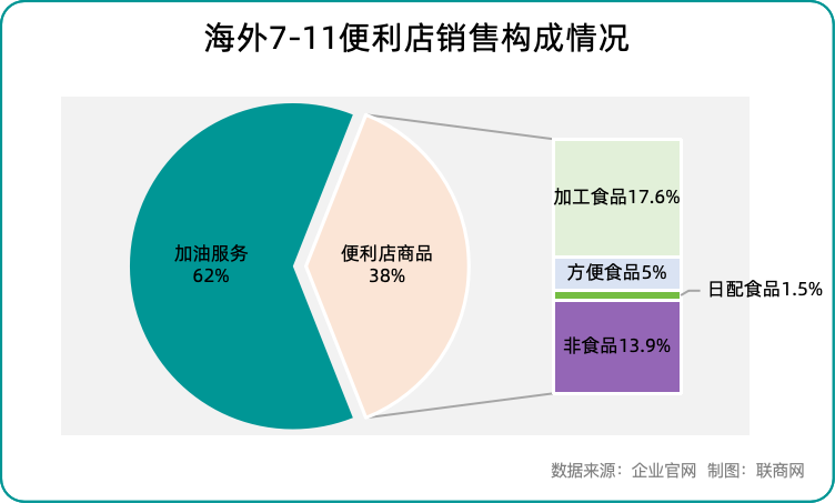 另外,細(xì)化到海外核心北美市場,同期銷售額構(gòu)成比如下:加工食品17.6%、方便食品5%、日配食品1.5%、非食品13.9%、加油服務(wù)62%。對比日本本土市場,加工食品26.6%、快餐29.2%、日配食品12.5%、非食品31.7%。受益于“加油站附設(shè)店”的模式,北美7-11銷售額遠(yuǎn)超本土店,但食品銷售相對薄弱。