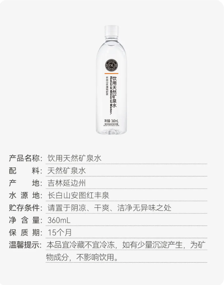 據(jù)了解,該產(chǎn)品由長(zhǎng)白山水源地直接灌裝,凈含量360ml,保質(zhì)期為15個(gè)月,含有天然礦物質(zhì),偏硅酸含量≥50.0mg/L(國(guó)家標(biāo)準(zhǔn)GB 8537飲用天然礦泉水中規(guī)定偏硅酸含量≥25.0mg/L)。