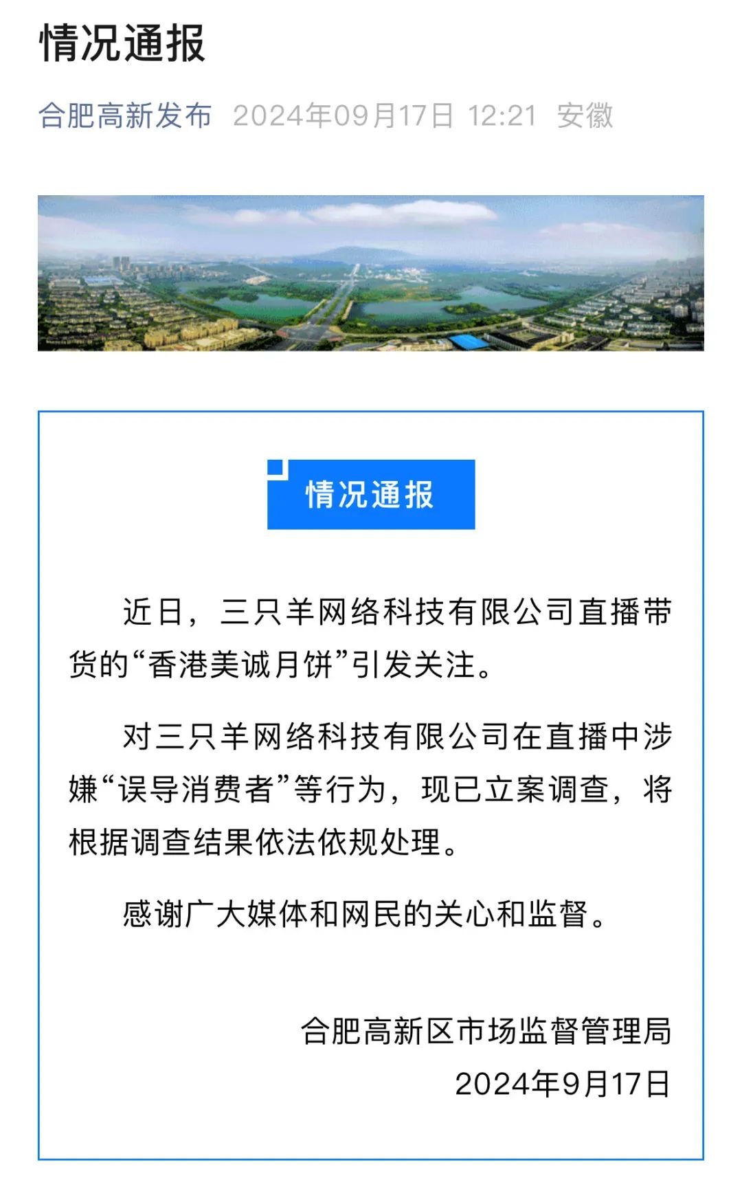 值得一提的是,今日,合肥高新區(qū)市場(chǎng)監(jiān)督管理局發(fā)布情況通報(bào):對(duì)三只羊網(wǎng)絡(luò)科技有限公司在直播中涉嫌“誤導(dǎo)消費(fèi)者”等行為,現(xiàn)已立案調(diào)查,將根據(jù)調(diào)查結(jié)果依法依規(guī)處理。