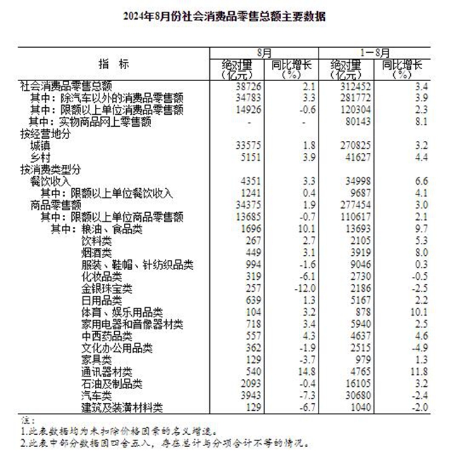 8月社會消費品零售總額同比增長2.1%