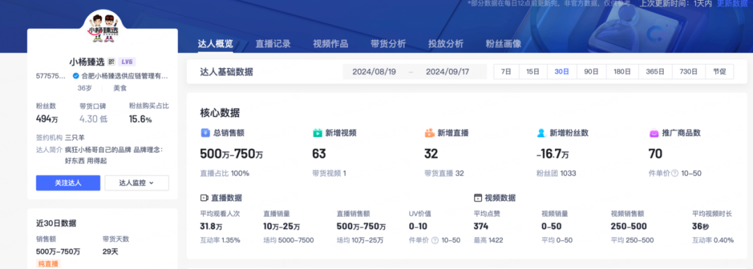 截至近30天內(nèi),小楊哥“三只羊網(wǎng)絡(luò)”旗下自有品牌“小楊甄選”粉絲數(shù)接近500萬,對于客單價10-50元商品而言,純直播銷售額來到500萬-750萬,再度延續(xù)了大小楊哥低價走量的帶貨風(fēng)格。