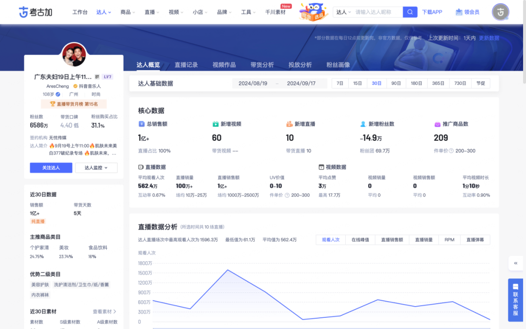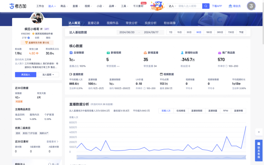 以抖音平臺為例,考古加官方數(shù)據(jù)顯示,坐擁1.18億粉絲的大小楊哥,單件客單價為100-200,尚不及僅有6000萬粉絲的廣東夫婦。