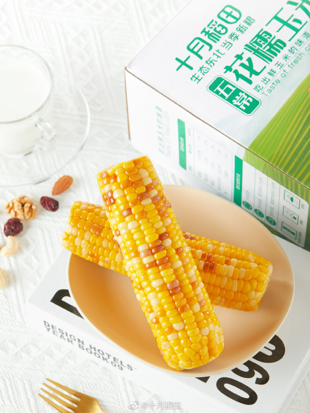 于是十月稻田打破品類(lèi)限制,把玉米打造成輕食和零食產(chǎn)品,從餐桌上的主食一躍切入快消品市場(chǎng)。旗下所推出的黃糯玉米線(xiàn)上平臺(tái)售價(jià)29.9元一包,每包8根,算下來(lái)每根玉米僅需3~4元。獨(dú)立真空包裝方便攜帶、輕微加熱即可食用,對(duì)打工人而言可以說(shuō)是相當(dāng)友好。