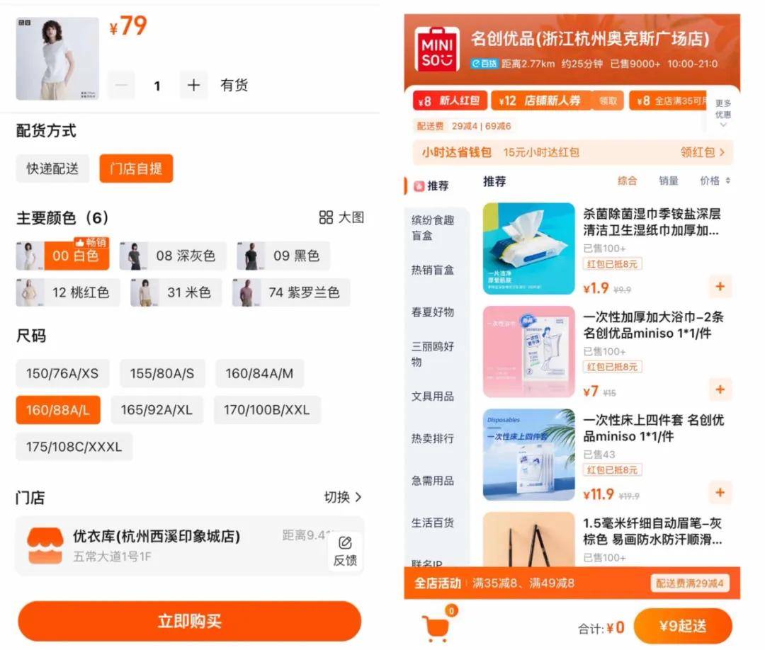 優(yōu)衣庫可以選擇門店自提,名創(chuàng)優(yōu)品的爆款為一次性浴巾、四件套等