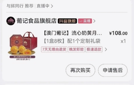 據(jù)相關(guān)報道,此前“與輝同行”直播間推薦了葡記食品抖音旗艦店出售的“澳門葡記流心奶黃月餅”,售價為108元每盒。