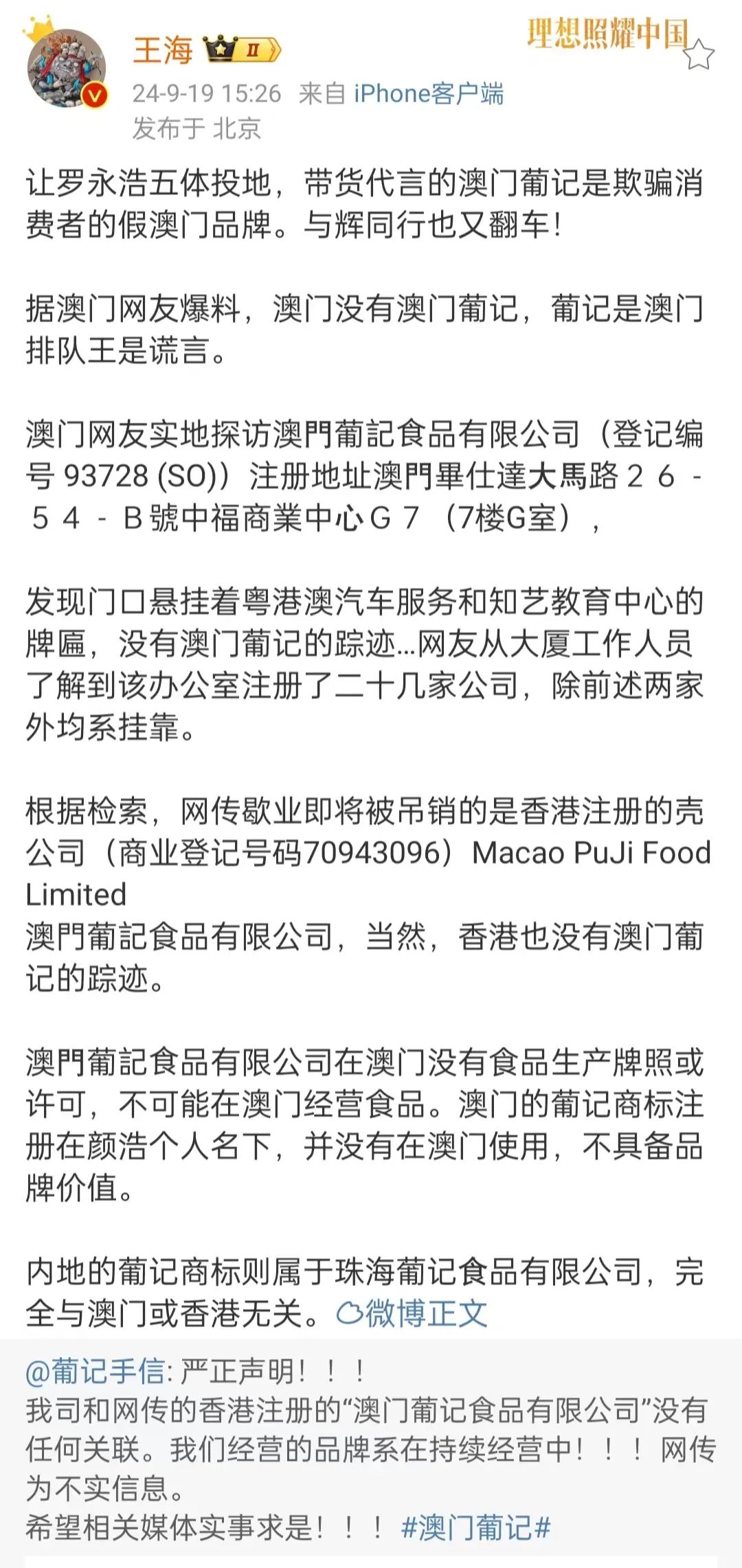 該葡記品牌發(fā)出微博澄清后,打假人王海出場了。