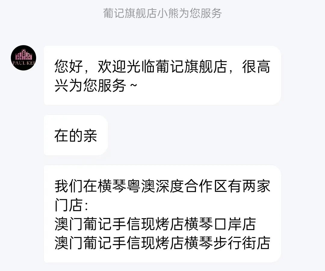 楊子就此事咨詢了葡記品牌的客服人員?头硎,澳門葡記在橫琴粵澳深度合作區(qū)有兩家門店。