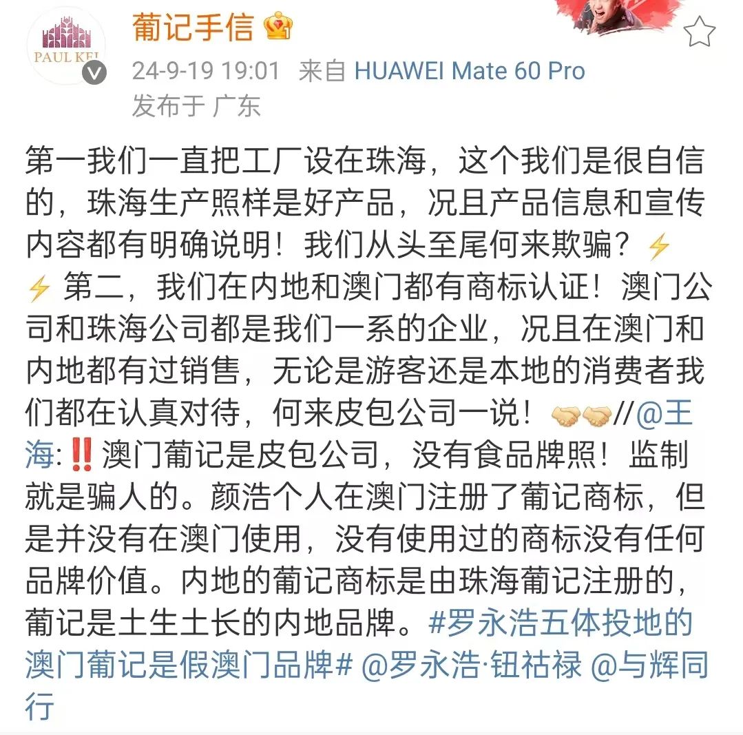 他表示,澳門沒有澳門葡記的門店,澳門葡記食品有限公司雖然是在澳門注冊的,但只是一家皮包公司,沒有食品牌照,更談不上所謂的監(jiān)制。葡記在珠海生產(chǎn),并注冊了內(nèi)地商標(biāo),是土生土長的內(nèi)地品牌。