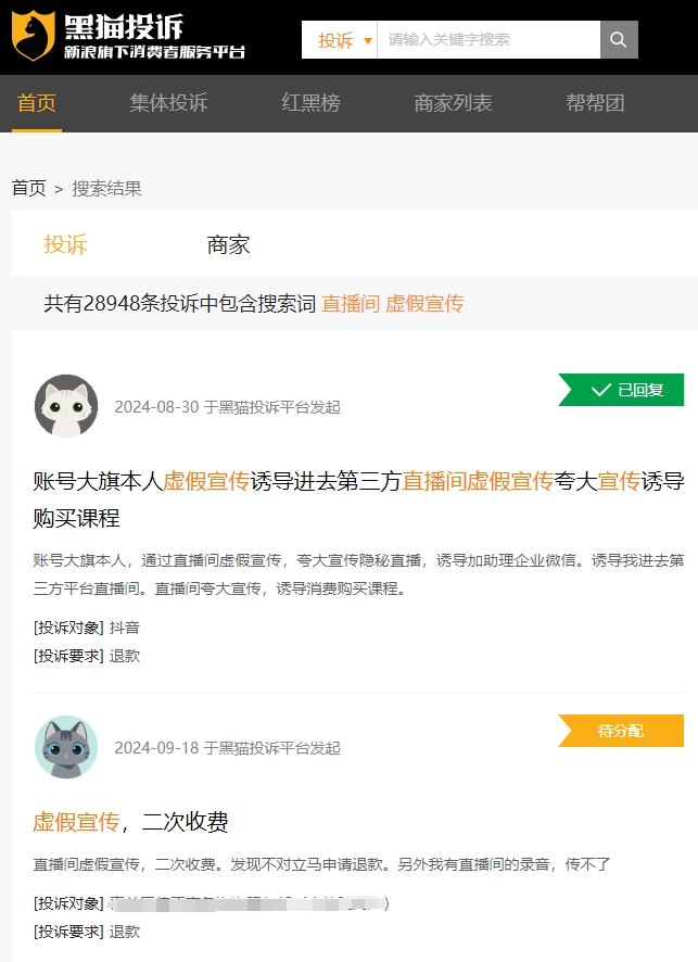 截至9月19日,黑貓投訴平臺(tái)上關(guān)于“直播間 虛假宣傳”的投訴已累積超過(guò)2.8萬(wàn)條,凸顯了問(wèn)題的普遍性和嚴(yán)重性。