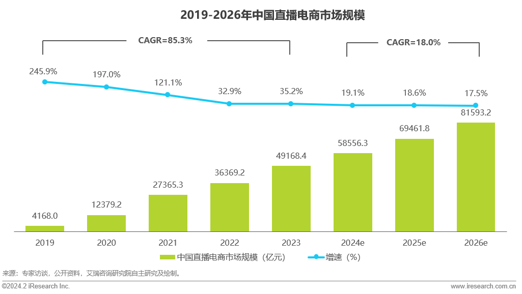 據(jù)艾瑞咨詢《2023年中國(guó)直播電商行業(yè)研究報(bào)告》顯示,直播電商市場(chǎng)持續(xù)高速增長(zhǎng),成交額已突破4.9萬(wàn)億,年復(fù)合增長(zhǎng)率預(yù)計(jì)在未來(lái)三年內(nèi)仍能保持18%左右,市場(chǎng)潛力巨大,遠(yuǎn)未觸及天花板。