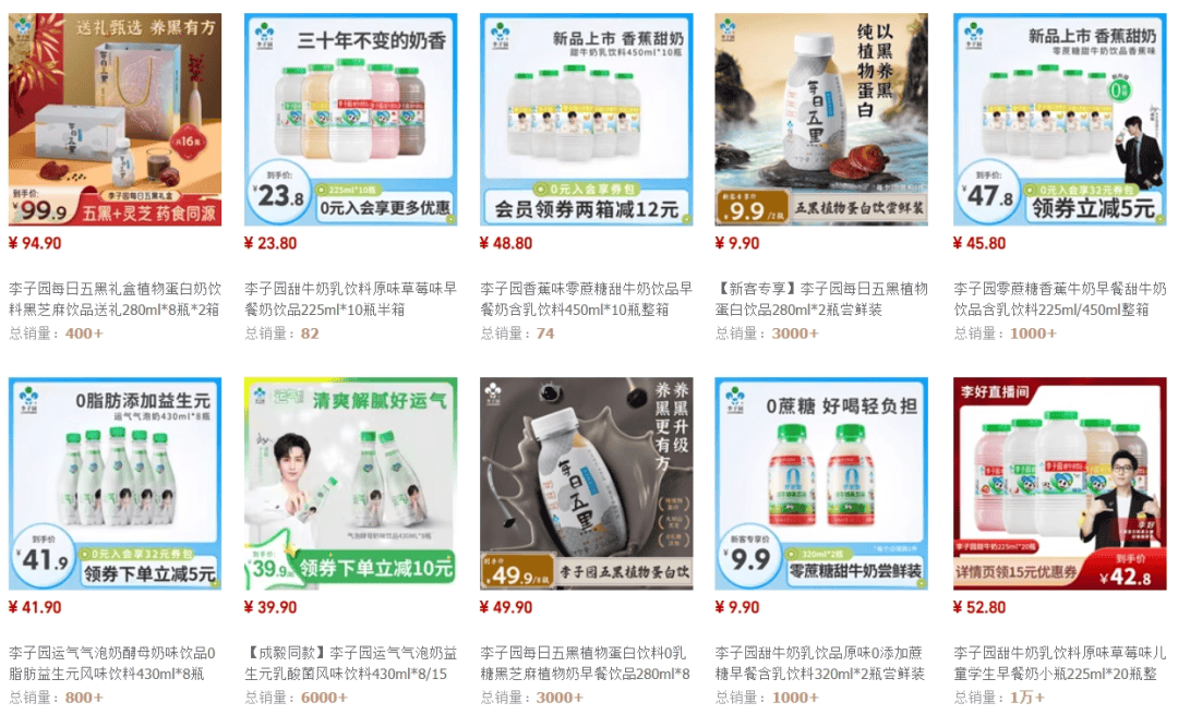 李子園的天貓旗艦店顯示,“零蔗糖甜牛奶”“五黑植物蛋白飲”“零脂肪氣泡奶”等新品的銷(xiāo)量要遠(yuǎn)低于“甜牛奶”。