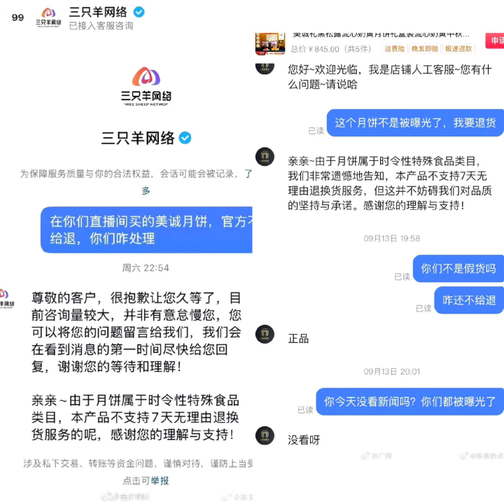 本來59元拍一發(fā)三的美誠月餅被反向砍到了169元三盒,瘋狂小楊哥在爆雷前把美誠月餅賣出去了5000萬銷售額,在這里面,有老板大批量購買后給員工發(fā)放公司福利的,有女婿給岳父岳母送禮的,還有中秋節(jié)走親戚給七大姑八大姨送的......這些買家很快就成了美誠月餅事件的第一批受害人。