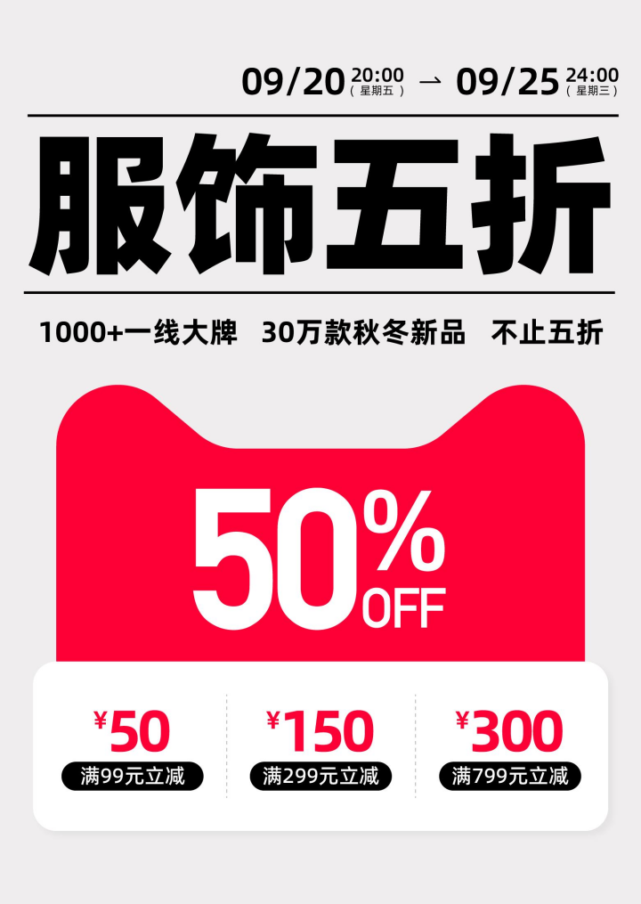 此次,天貓服飾推出的5折會場力度空前,在氣溫一秒“滿30減15”的季節(jié),超高性價比的當季大牌新品都可以滿足消費者長假出游季和降溫季買買買的全部需求。