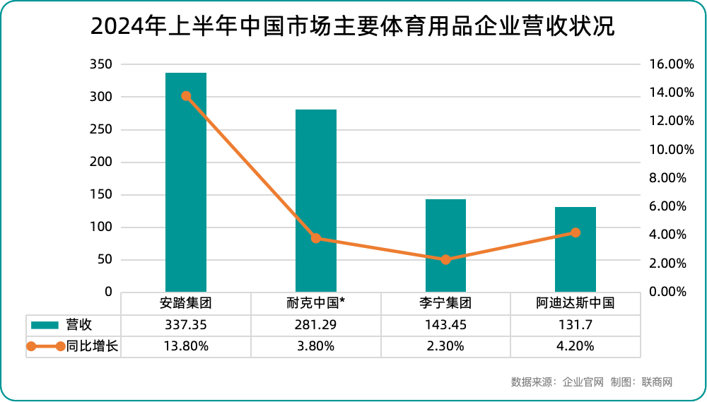 另外,通過分析這幾家頭部企業(yè)2024年上半年業(yè)績可知,雖然耐克營收規(guī)模仍然可觀,但增速相對較緩。相較之下,安踏集團同比增長最快,達到13.80%。而身處耐克之后的李寧和阿迪達斯相對穩(wěn)定。
