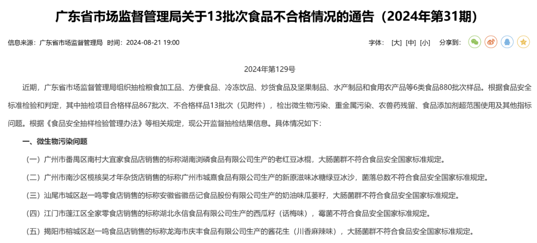 就在不久前,根據(jù)廣東省市場監(jiān)管局的通告,汕尾市城區(qū)趙一鳴零食店銷售的奶油味瓜蔞籽、揭陽市榕城區(qū)趙一鳴食品店銷售的醬花生(川香麻辣味),這2批次樣品都被檢出大腸菌群超標。