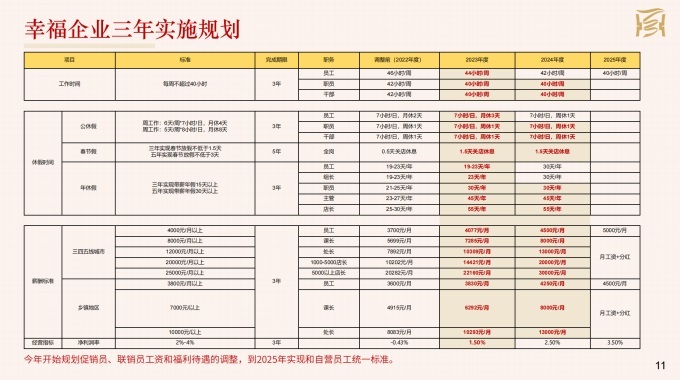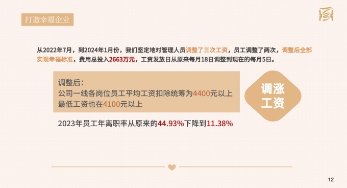 從2022年7月,到2024年1月份,我們堅定地對管理人員調(diào)整了三次工資,員工調(diào)整兩次,調(diào)整后全部實現(xiàn)幸福標準,費用總投入2663萬元。工資發(fā)放日從原來每月18日調(diào)整到5日。調(diào)整的過程中,壓力很大,因為不確定結(jié)果。尤其是在今年1月份對全體員工做二次工資調(diào)整的時候,公司中高層都非常反對,有些門店員工也提出申請,不漲工資。