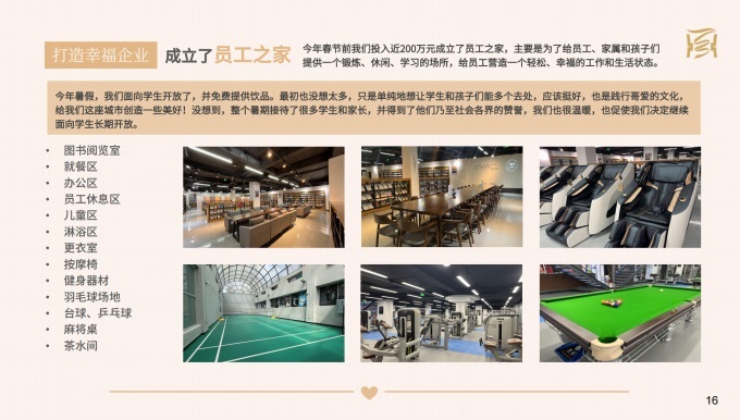 今年春節(jié)前我們投入近200萬元成立了員工之家,主要是為了給員工、家屬和孩子們提供一個鍛煉、休閑、學習的場所,給員工營造一個輕松、幸福的工作和生活狀態(tài)。今年暑假,我們面向?qū)W生開放了,并免費提供飲品。最初也沒想太多,只是單純地想讓學生和孩子們能多個去處,應(yīng)該挺好,也是踐行東來哥愛的文化,給我們這座城市創(chuàng)造一些美好!沒想到,整個暑期接待了很多學生和家長,并得到了他們乃至社會各界的贊譽,我們也很溫暖,也促使我們決定繼續(xù)面向?qū)W生長期開放。