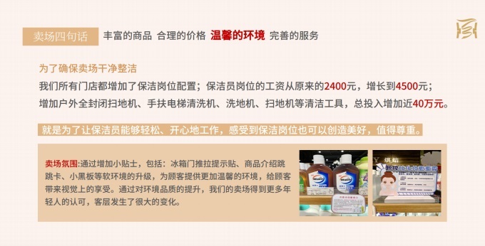 為了確保賣場干凈整潔,我們所有門店都增加了保潔崗位配置;保潔員崗位的工資從原來的2400元,增長到4500;增加戶外全封閉掃地機、手扶電梯清洗機、洗地機、掃地機等清潔工具,總投入增加近40萬元。就是為了讓保潔員能夠輕松、開心地工作,感受到保潔崗位也可以創(chuàng)造美好,值得尊重。賣場氛圍,通過增加小貼士,包括:冰箱門推拉提示貼、商品介紹跳跳卡、小黑板等軟環(huán)境的升級,為顧客提供更加溫馨的環(huán)境,給顧客帶來視覺上的享受。通過對環(huán)境品質(zhì)的提升,我們的賣場得到更多年輕人的認可,客層發(fā)生了很大的變化。