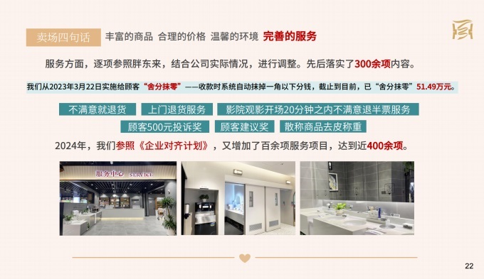 服務(wù)方面,逐項參照胖東來,結(jié)合公司實際情況,進行調(diào)整,先后落實了300余項內(nèi)容。我們從2023年3月22日實施給顧客“舍分抹零”——收款時系統(tǒng)自動抹掉一角以下分錢,截止到目前,已“舍分抹零”51.49萬元。實行不滿意就退貨和上門退貨服務(wù),以及影院觀影開場20分鐘之內(nèi)不滿意退半票服務(wù);還設(shè)立了顧客500元投訴獎和顧客建議獎、以及散稱商品去皮稱重等。2024年,我們參照《種子班企業(yè)對齊計劃》,又增加了百余項服務(wù)項目,達到近400余項。