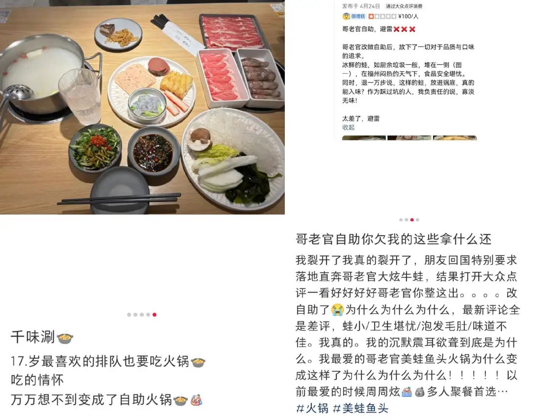 有消費者表示“只有鍋底自帶的牛蛙好吃,后面點的都沒有調(diào)味,白花花下進去,撈出來也不好吃!倍藭r的大規(guī)模閉店,也讓不少消費者認為其是在“借著自助的名頭清庫存”。