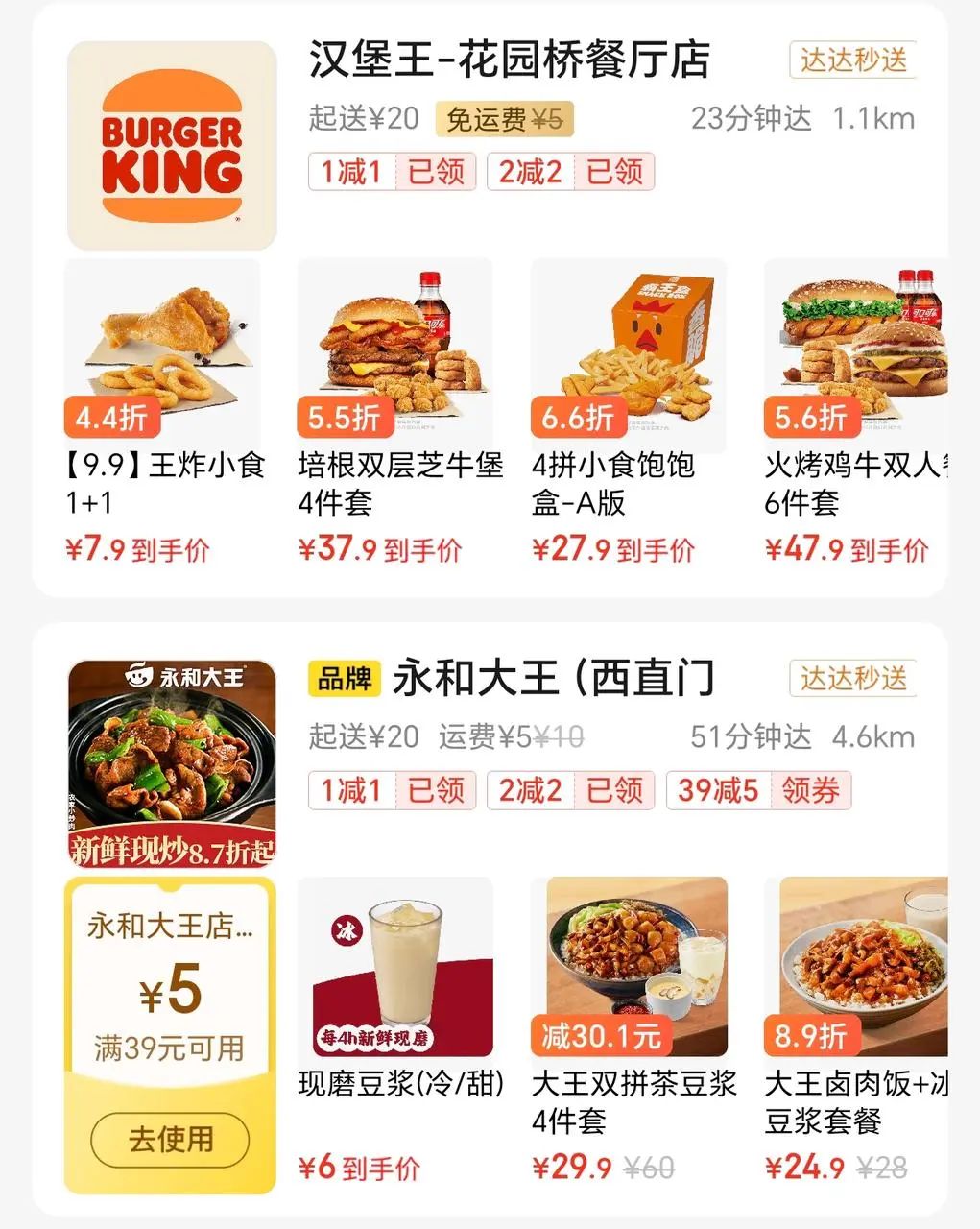 除秒送在首頁有2個關(guān)鍵入口,且秒送的低價活動非常多樣且顯著外,其咖啡奶茶專區(qū)還上線了快餐代表漢堡王和永和大王。