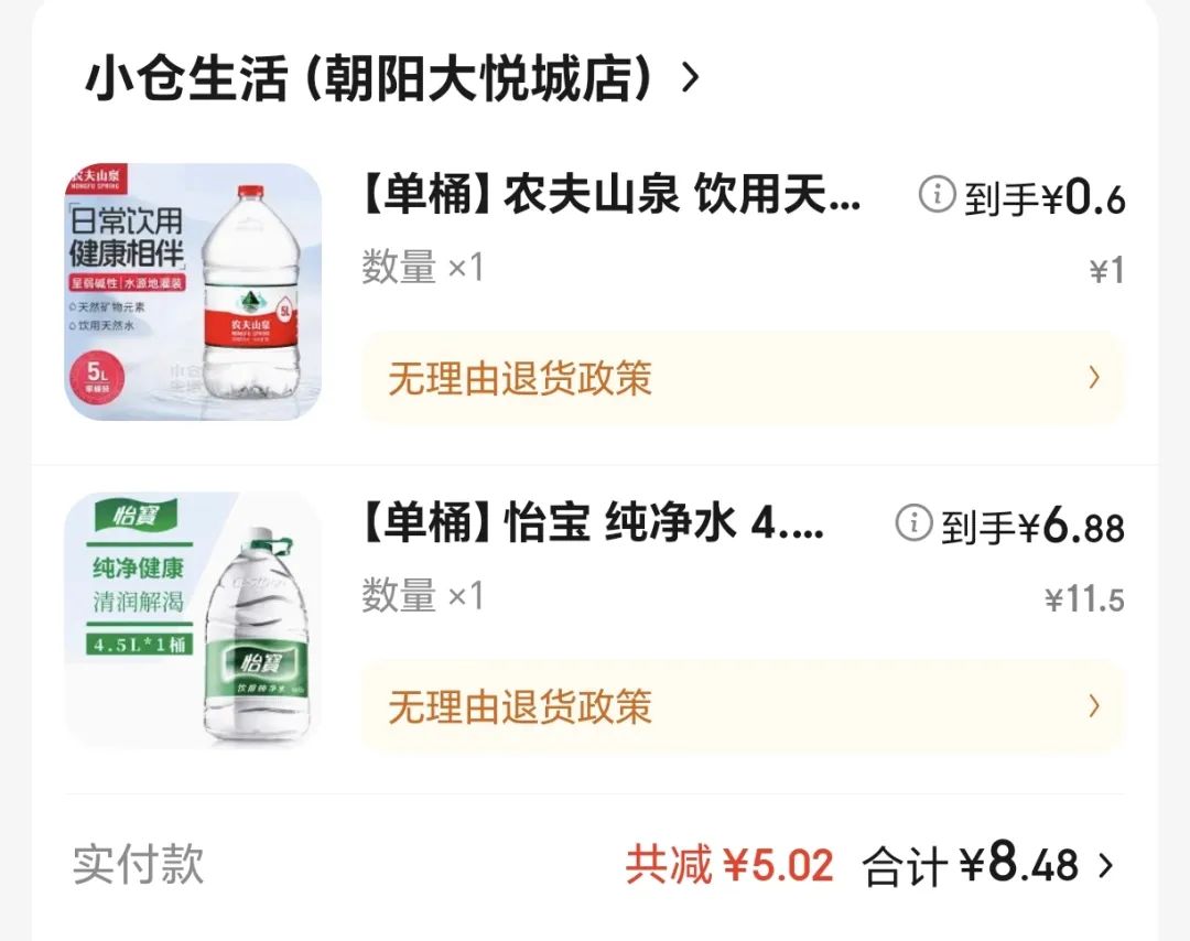 對用戶來說,湊平臺的極致滿減一直是復(fù)雜的數(shù)學(xué)題,有時是偽命題。但經(jīng)測試,在京東秒送,以北京小倉超市為例,用戶實付8.48元能夠買到規(guī)格5L的農(nóng)夫山泉,和4.5L的怡寶純凈水。