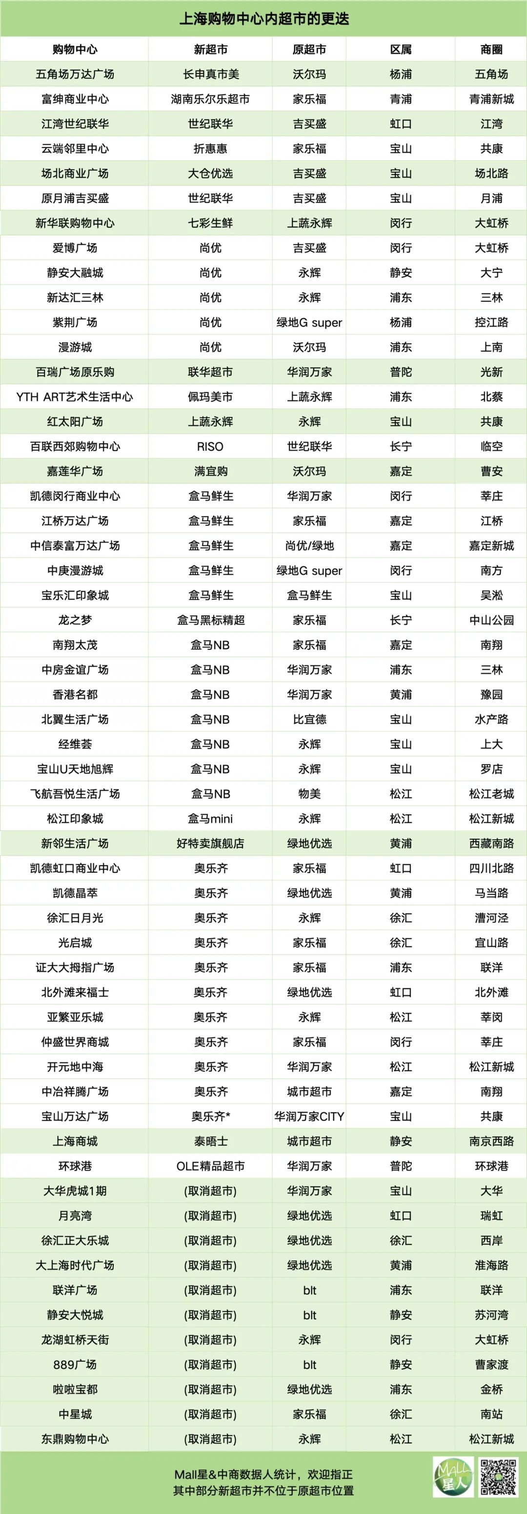 如:長寧龍之夢時尚生活中心的家樂福撤退,超市主力店換成了盒馬黑標(biāo)店和奧樂齊;金橋太茂的G-Super綠地優(yōu)選、長泰國際商業(yè)廣場的明康匯、保利時光里的eat!@7fresh中超均變成了盒馬鮮生;寶山招商花園城、凱德晶萃廣場、北外灘來福士、開元地中海、南翔中冶祥騰廣場、近鐵城市廣場、徐匯日月光的超市主力也均換成了奧樂齊。