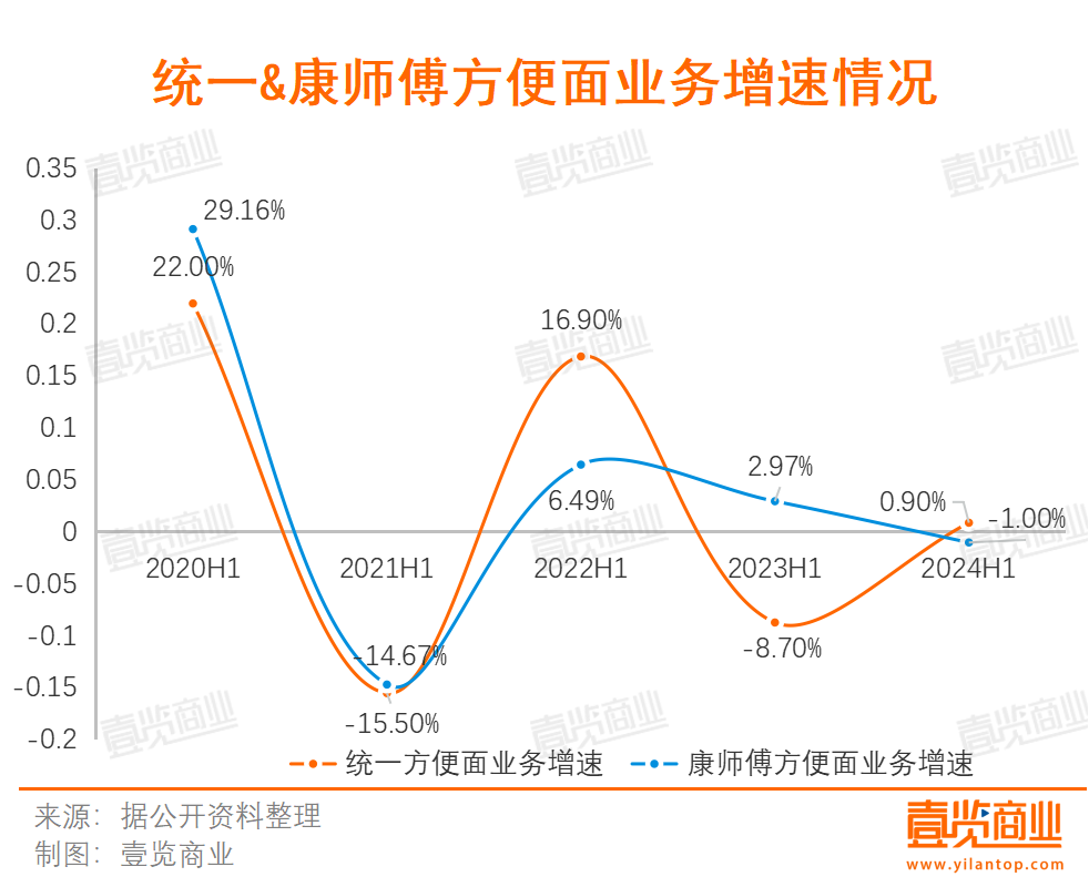 無(wú)論是統(tǒng)一還是康師傅,方便面業(yè)務(wù)的增速都呈下行趨勢(shì),到了今年上半年,統(tǒng)一方便面業(yè)務(wù)僅同比增長(zhǎng)0.9%,康師傅方便面業(yè)務(wù)同比負(fù)增長(zhǎng)。