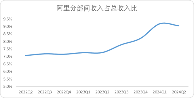 隨著阿里內(nèi)部逐漸調(diào)整架構(gòu)和核算口徑,分部間收入的比重自2023Q2開始增長(zhǎng)迅猛,從側(cè)面也能證明阿里內(nèi)部的核算趨于獨(dú)立。