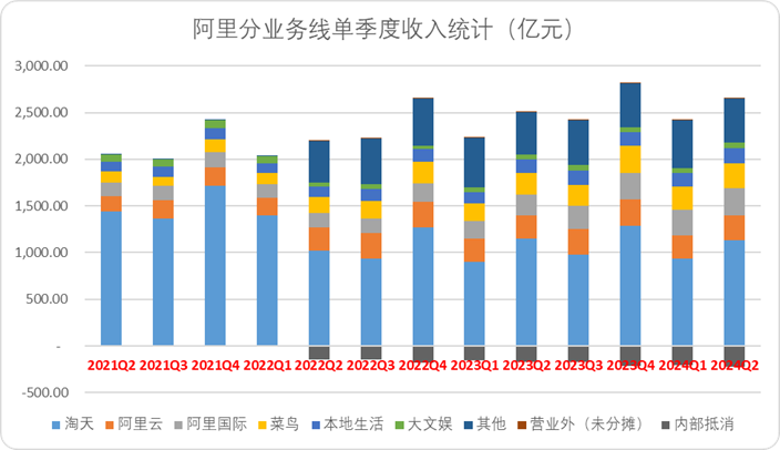 圖:阿里單季度分業(yè)務(wù)線收入,來源:企業(yè)財(cái)報(bào),錦緞研究院