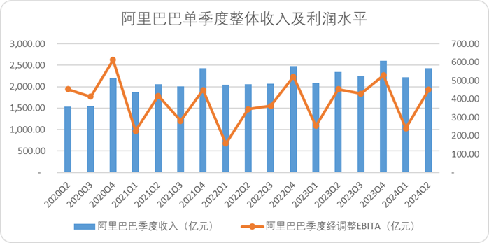 2024年二季度,阿里整體錄得營收2432億元,同比增長(zhǎng)4%,環(huán)比增長(zhǎng)9.6%,經(jīng)調(diào)整EBITA錄得450.35億元,同比下降1%,整體的收入規(guī)模和利潤(rùn)水平出現(xiàn)了背離。