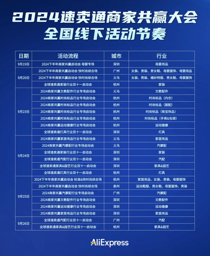 9月底短短一周內(nèi),速賣通就在杭州、義烏、深圳、廣州、泉州等多個跨境商家聚集的核心產(chǎn)業(yè)帶召開近30場雙11招商會,為跨境商家?guī)砣曜畲蟮纳庠鲩L機會。