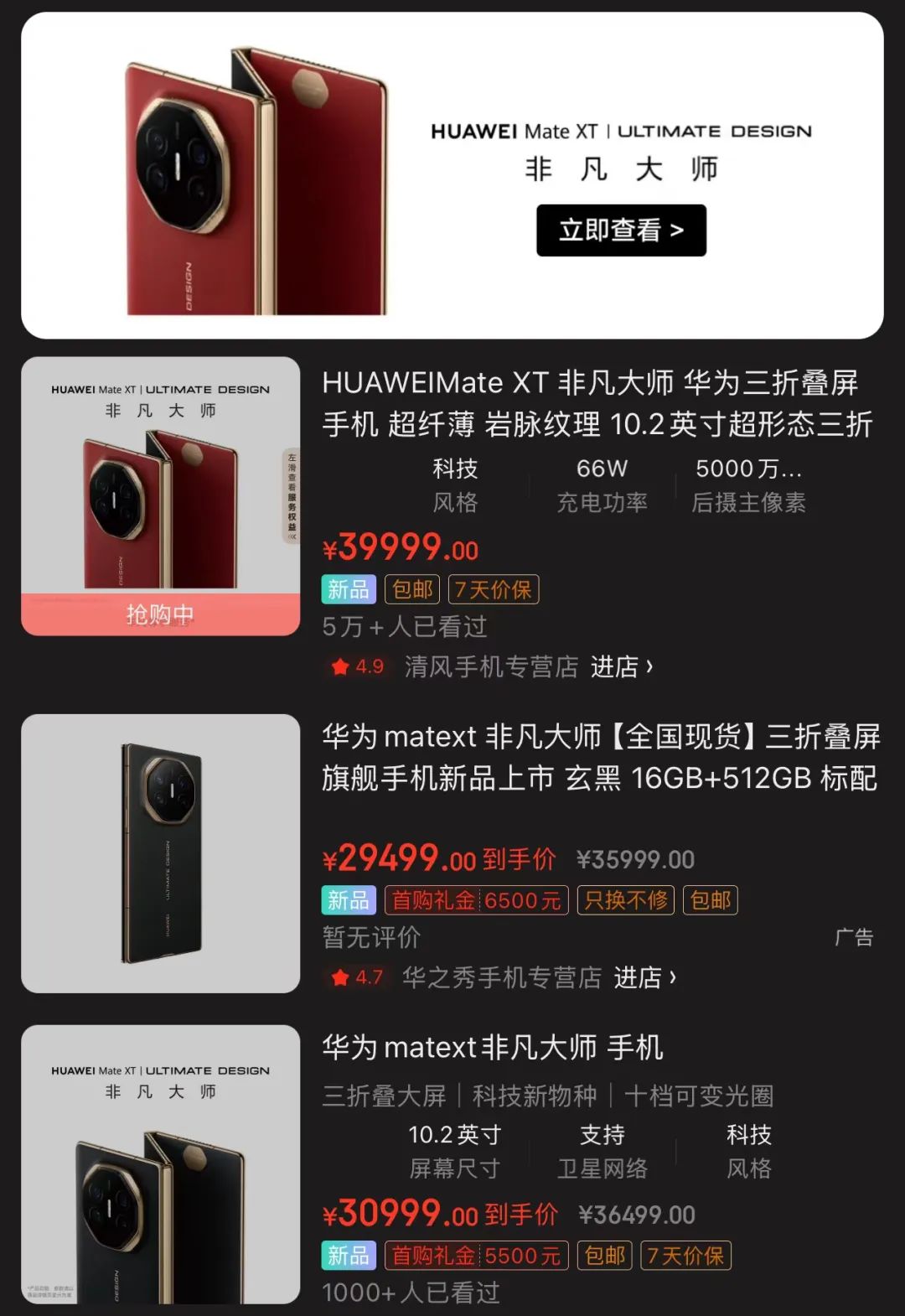 而此后三天,二級(jí)市場(chǎng)的走向正如老周所預(yù)料,無(wú)厘頭的瘋狂溢價(jià)很快便隨著時(shí)間而消退——512GB、黑色款華為Mate XT最先吹響降價(jià)的號(hào)角,在短短幾天內(nèi)從加價(jià)2萬(wàn)元猛跌至5000到6000元,而其他型號(hào)亦未能幸免,跌勢(shì)迅速波及全線。