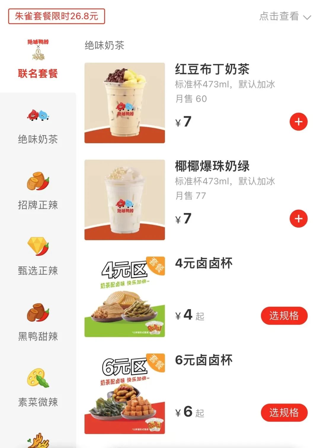 例如絕味鴨脖在“絕味奶茶”類目下,還增加了4元、6元和8元的“鹵鹵杯”,口號是“奶茶配鹵味,快樂加倍”,來吸引顧客消費(fèi)。