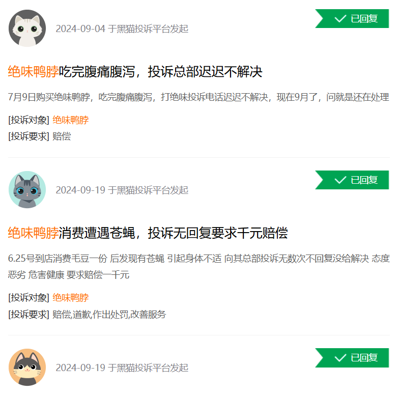 值得一提的是,瘋狂擴(kuò)張階后不可避免還會出現(xiàn)食安問題。黑貓投訴平臺上以“絕味鴨脖”為關(guān)鍵詞進(jìn)行搜索,有1100多條投訴,大多集中在產(chǎn)品變質(zhì)、衛(wèi)生條件不達(dá)標(biāo)、吃完后身體出現(xiàn)問題等。