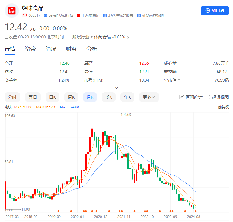 反饋到資本市場上,作為鹵味三巨頭中的大哥,絕味食品從2021年的股價超百元一路下跌到現(xiàn)在只有12.5元左右,累計(jì)下跌近90%。