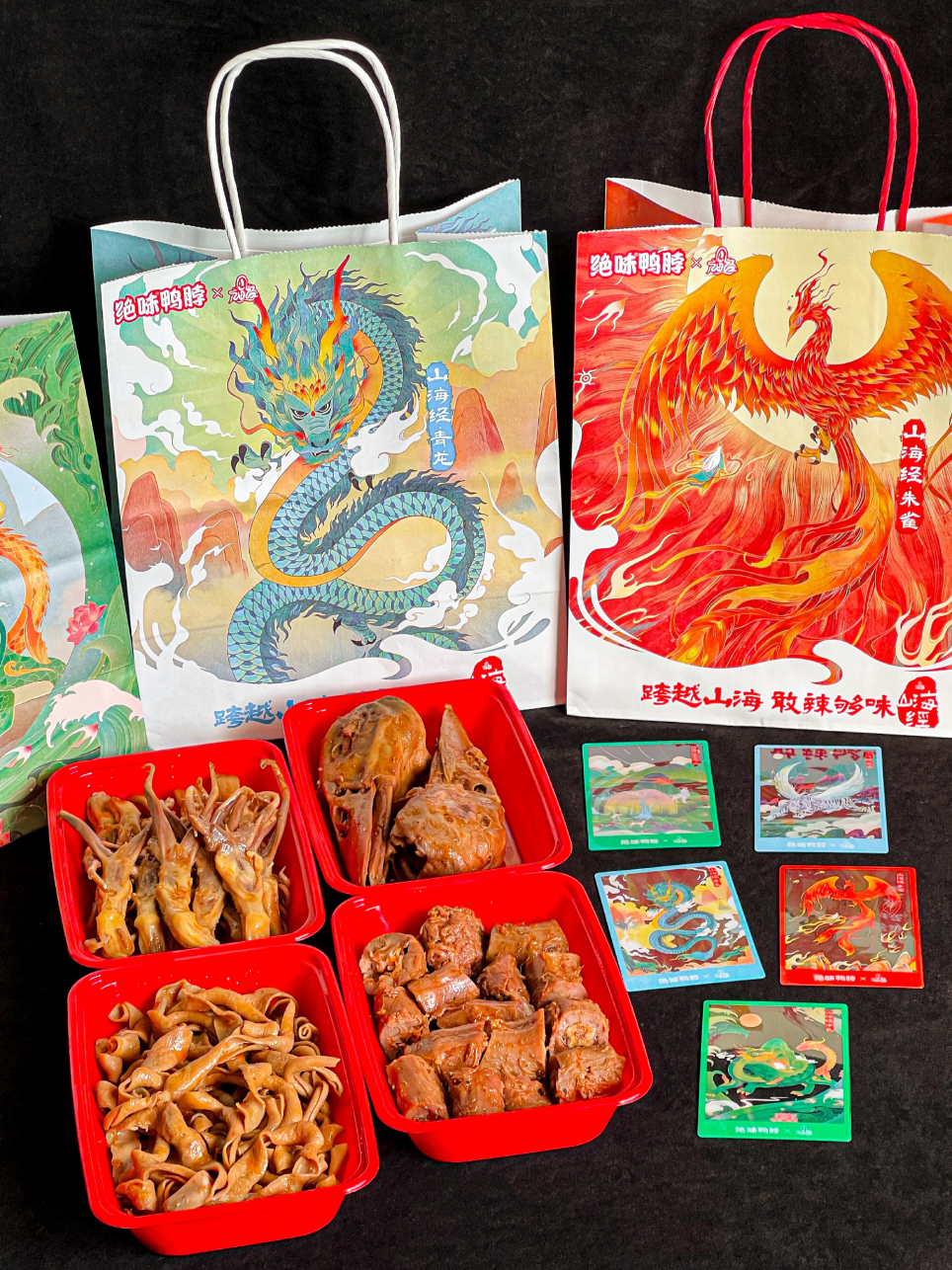 品牌升級和簽約代言人只是其一,2023年絕味食品還模仿新茶飲賽道屢試不爽的聯(lián)名策略進(jìn)行跨界,官宣聯(lián)名《甄嬛傳》推出“絕味紅寶石蝦球”聯(lián)名套餐和劇集角色卡牌等;最近又聯(lián)名山海經(jīng),只要在限定時間內(nèi)全場購物滿26.8元即可贈送限量紙袋和透卡。