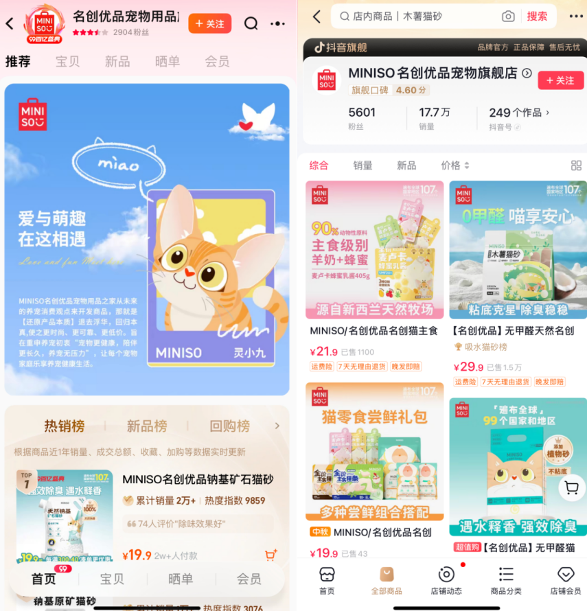 從品類拓展看,名創(chuàng)優(yōu)品在淘寶、抖音等線上電商渠道低調上線了寵物用品官方旗艦店,并推出了全新的寵物食品和寵物用品產品線,與旗艦店區(qū)分,為單獨的產品矩陣。