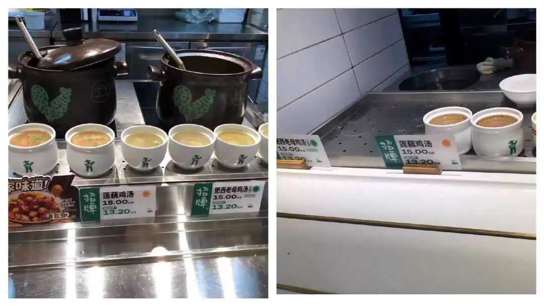老鄉(xiāng)雞武大店的菜品種類和校外差不多,價(jià)格也差不多。以肥西老母雞湯和蓮藕雞湯為例,武大店的價(jià)格均為15元,超級會員價(jià)為13.2元,相隔700米的校外老鄉(xiāng)雞店價(jià)格也是如此。