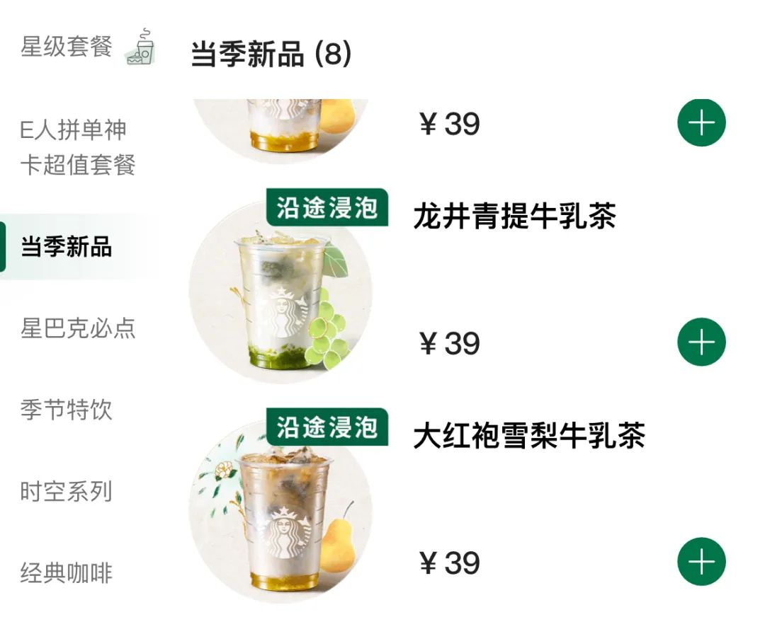 瑞幸推出奶茶一周后,星巴克也坐不住了,在推出新款“茶咖”的同時(shí),推出了兩款牛乳茶產(chǎn)品,分別是龍井青提牛乳茶、大紅袍雪梨牛乳茶。