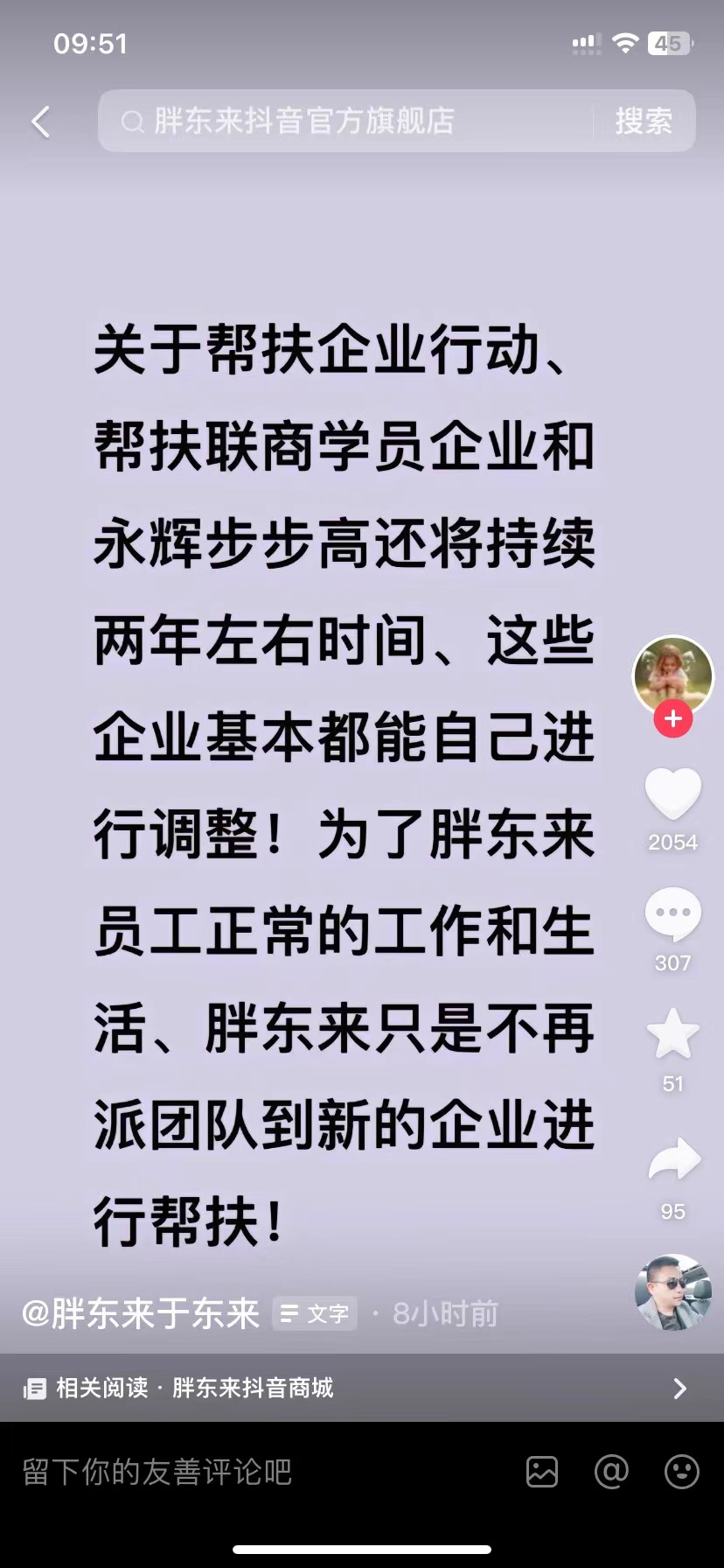 對此,很多媒體和網(wǎng)友解讀為胖東來因名創(chuàng)優(yōu)品入股永輝超市一事而停止企業(yè)幫扶行動。