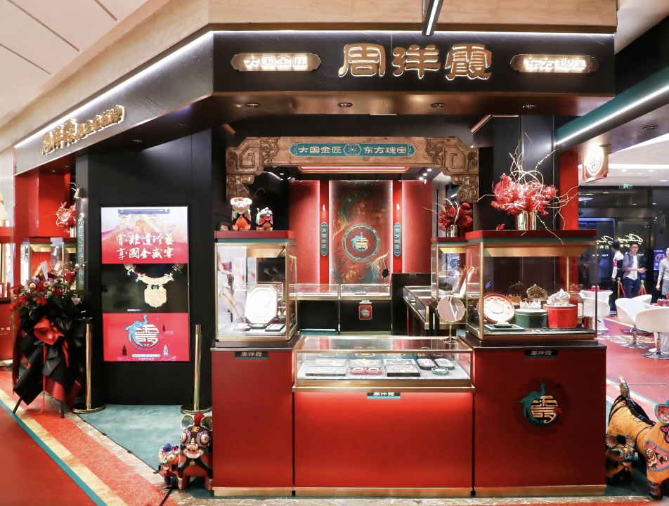 這家位于杭州西湖銀泰一樓的周洋霞非遺國金寶藏館,以木結(jié)構(gòu)為裝修基底、朱紅色與金色搭配,營造出世家傳承的古樸大氣氛圍,再配上柜內(nèi)陳列著的非遺傳承系列、原創(chuàng)設(shè)計(jì)的黃金飾品,散發(fā)著濃郁的國風(fēng)魅力。在專柜開業(yè)前,古樸大氣的圍擋,就吸引了不少顧客駐足。