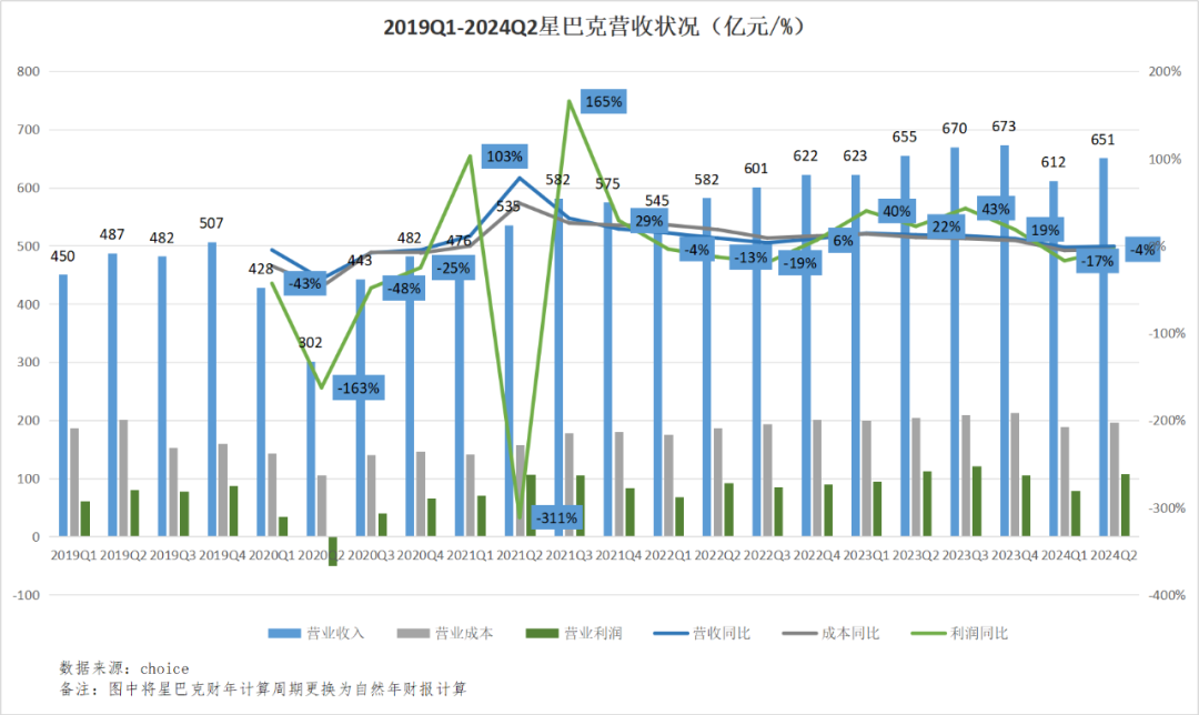 星巴克集團(tuán)過去五年的財報顯示,除2020年疫情影響導(dǎo)致的低營收基數(shù),大部分年份增速平緩,但營收體量保持穩(wěn)定。最大幅度的調(diào)整發(fā)生在今年上半年,營收連續(xù)兩季度下滑。