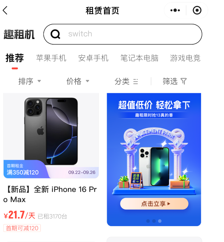 從產(chǎn)品頁來看,趣租機的入口在“我的錢包”里,提供包含電腦、手機、VR眼鏡等產(chǎn)品在內(nèi)的租賃服務(wù),模式為“以租代購+到期送”。連線Insight觀察到,趣租機業(yè)務(wù)之下,全新iPhone16promax手機僅需21.7/天,目前已租3170臺。