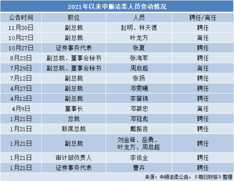 自2021年后,中順潔柔的高管不斷更迭,尤其是僅2021這一年內(nèi)人員變動(dòng)公告發(fā)表高達(dá)14次,三年前后離職人數(shù)接近10人。